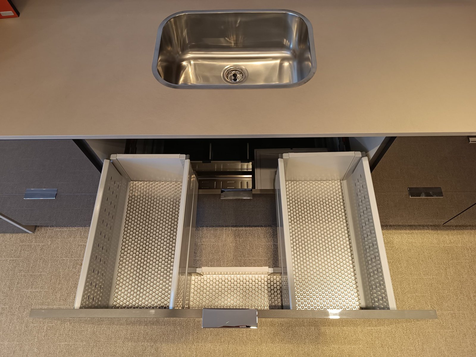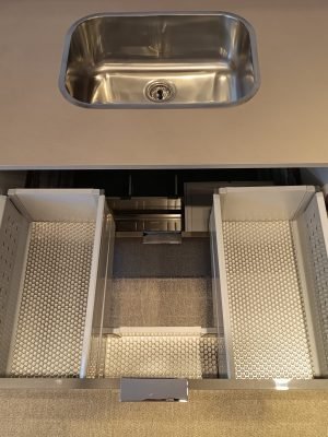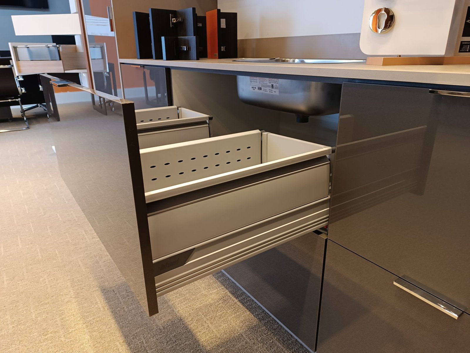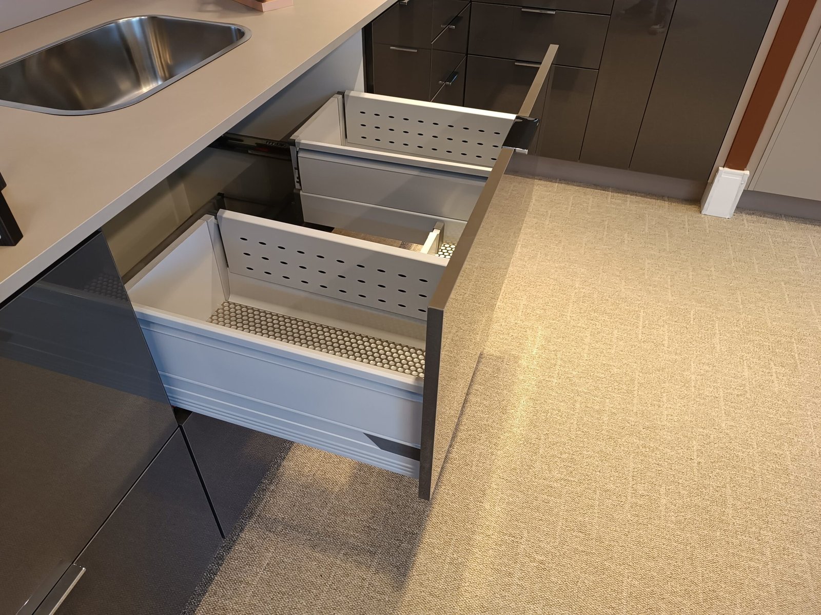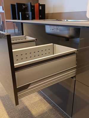 Na área da pia, o espaço disponível é especialmente valioso. Este armário de pia aproveita o espaço existente da melhor forma possível, garantindo, simultaneamente, acesso otimizado ao interior do armário. Assim, a bancada de trabalho permanece livre e os produtos de limpeza ficam rapidamente à mão. Este armário pode ser implementado com componentes Standard dos sistemas box LEGRABOX, MERIVOBOX e TANDEMBOX.