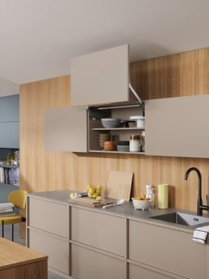 Surpreenda seus clientes com portas de elevação, que liberam totalmente a área de movimento: portas com AVENTOS HL top são ideais para armários que se encontram acima e sobre bancadas. Em um armário de sobrepor em uma bancada de trabalho, aparelhos elétricos também podem, com isto, ficar ocultos elegantemente atrás de uma frente.