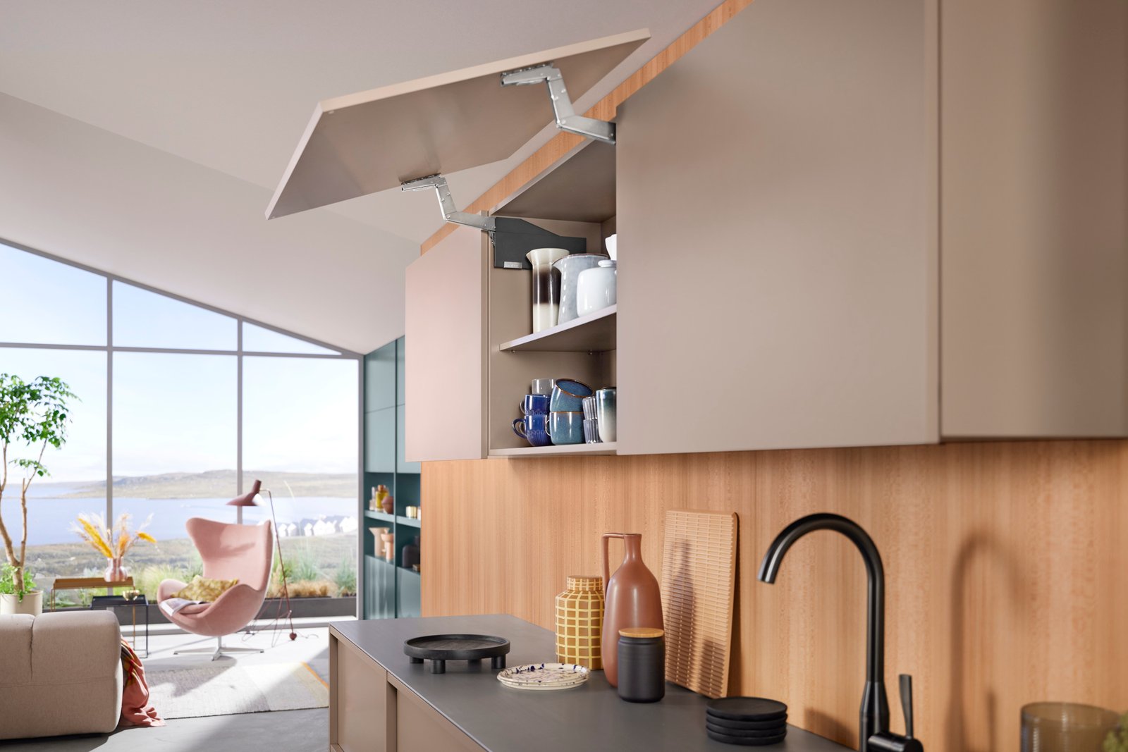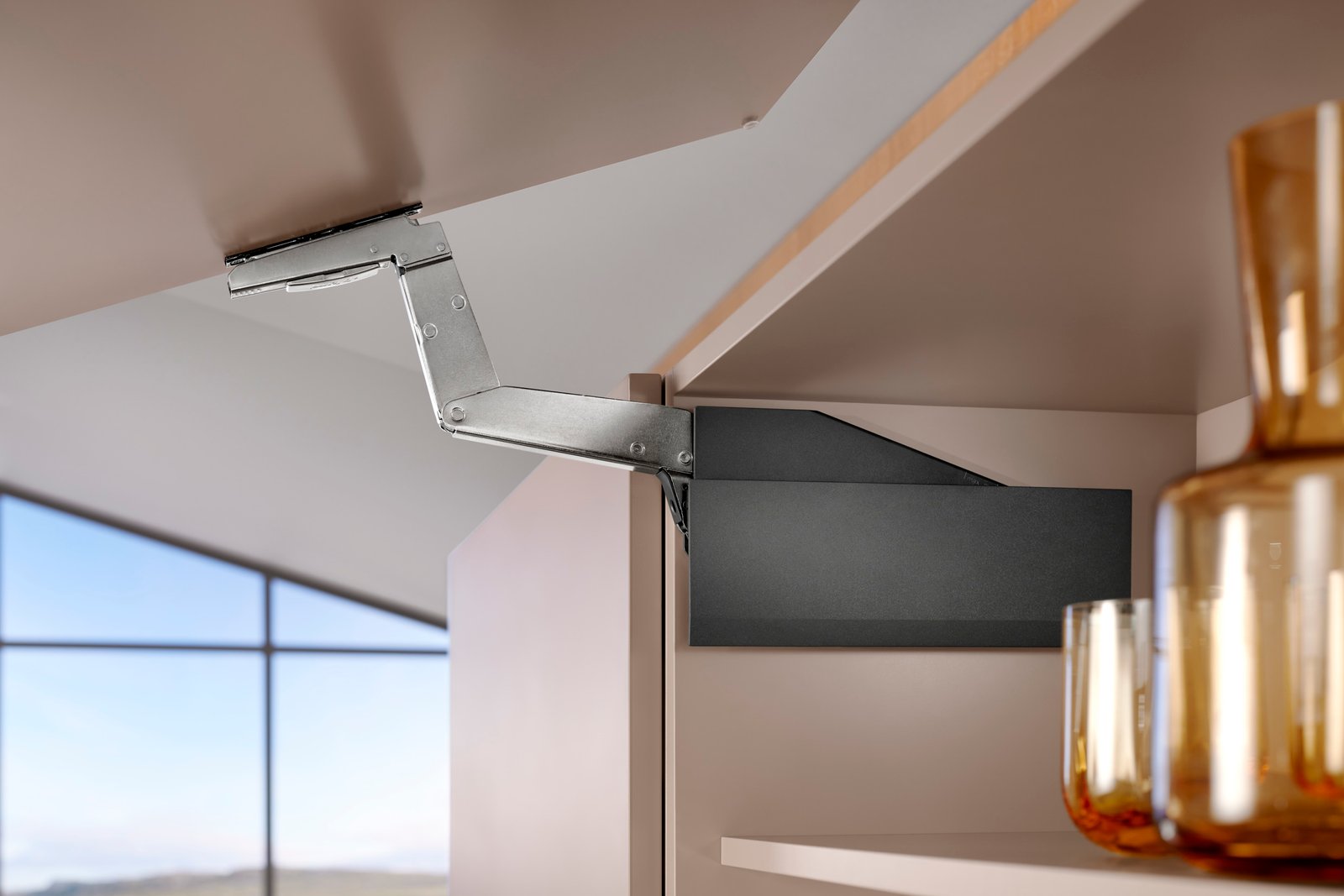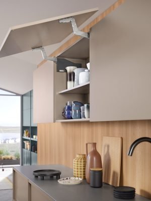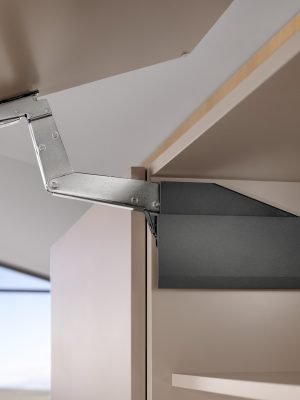 A ferragem para portas de elevação AVENTOS HS top no armário superior transmite uma sensação de leveza: frentes amplas, de uma só peça, podem ser facilmente movimentadas com ela e o acesso aos itens estocados é mantido a todo instante. Sendo assim, você também realiza facilmente variantes incomuns de design, como painéis de acabamento ou testeiras.