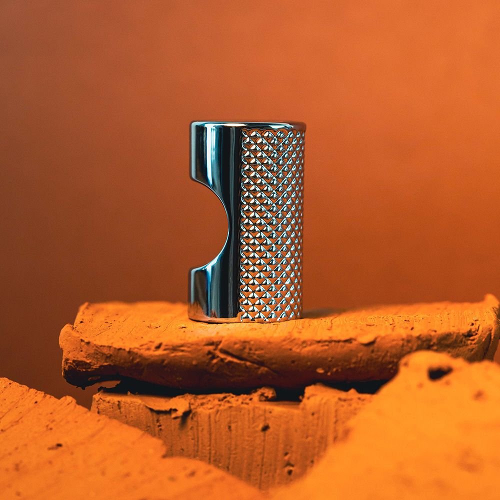 O puxador ponto da Linha Grid traz um visual sólido e detalhado, com recartilhado metálico que adiciona textura e sofisticação. A base lisa cria um contraste elegante, valorizando a peça como elemento decorativo e funcional. Perfeito para composições que buscam personalidade com sutileza, é uma escolha segura para projetos modernos e urbanos.