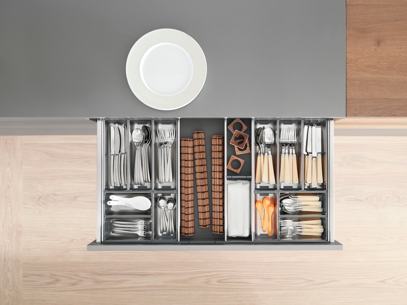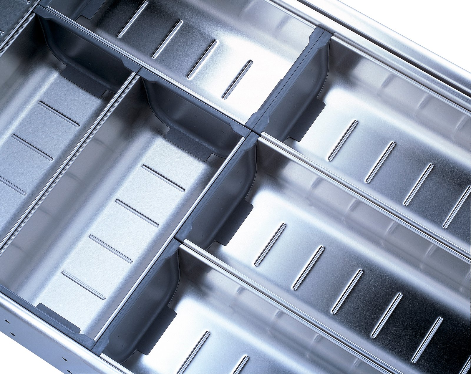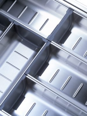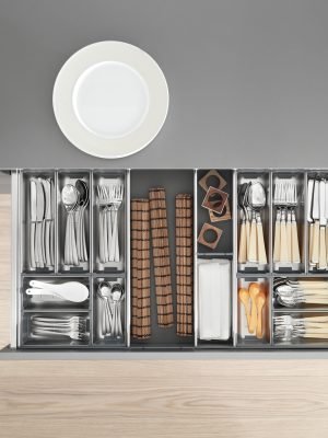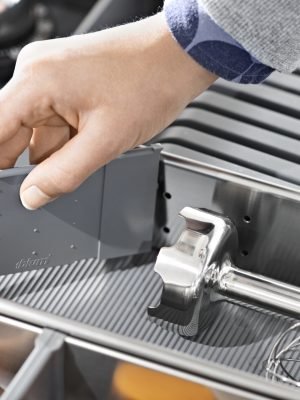 O sistema de divisões internas de alta qualidade proporciona uma organização inspiradora em cada gaveta ou extensão frontal. Sejam talheres de mesa, frascos ou panelas – todos os itens podem ser acondicionados de forma confortável e segura. Crie seu espaço disponível de acordo com as necessidades e visivelmente organizado.