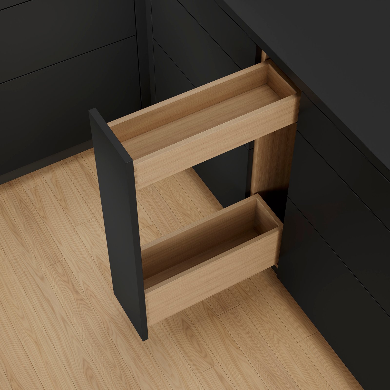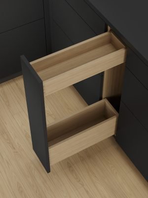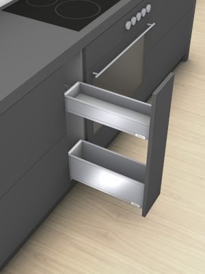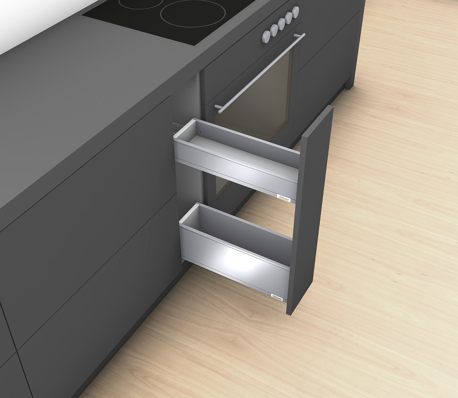 Armários estreitos aproveitam na cozinha até os menores vãos. Com SPACE TWIN, a Blum cria espaço disponível adicional graças às corrediças deslocadas diagonalmente – sem abdicar da estabilidade e da qualidade de movimento. Utensílios de preparação e elaboração de alimentos como frascos, tábuas, condimentos ou assadeiras têm aqui o lugar ideal.