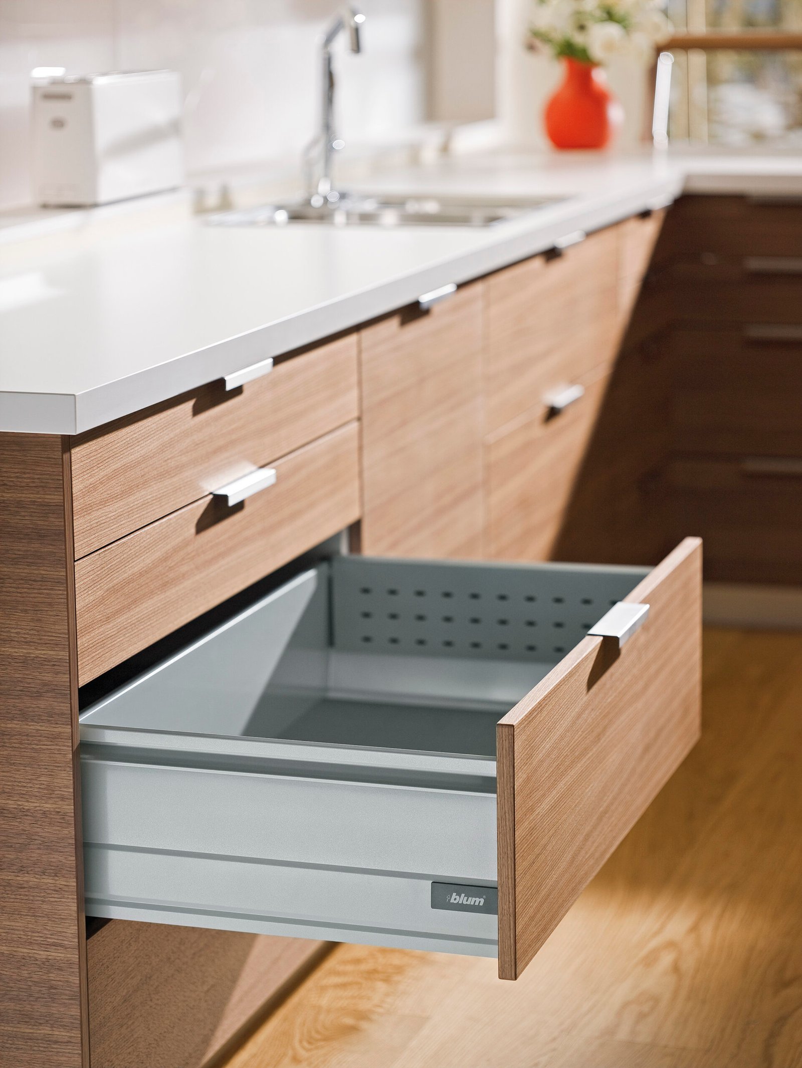 Responsáveis por isso são os cilindros em matéria plástica resistentes ao desgaste para um deslizamento suave e uma capacidade de carga dinâmica de 30 e 50 kg. Graças ao sistema adaptativo de amortecimento BLUMOTION garante-se um fechamento leve e silencioso. E por muito, muito tempo!